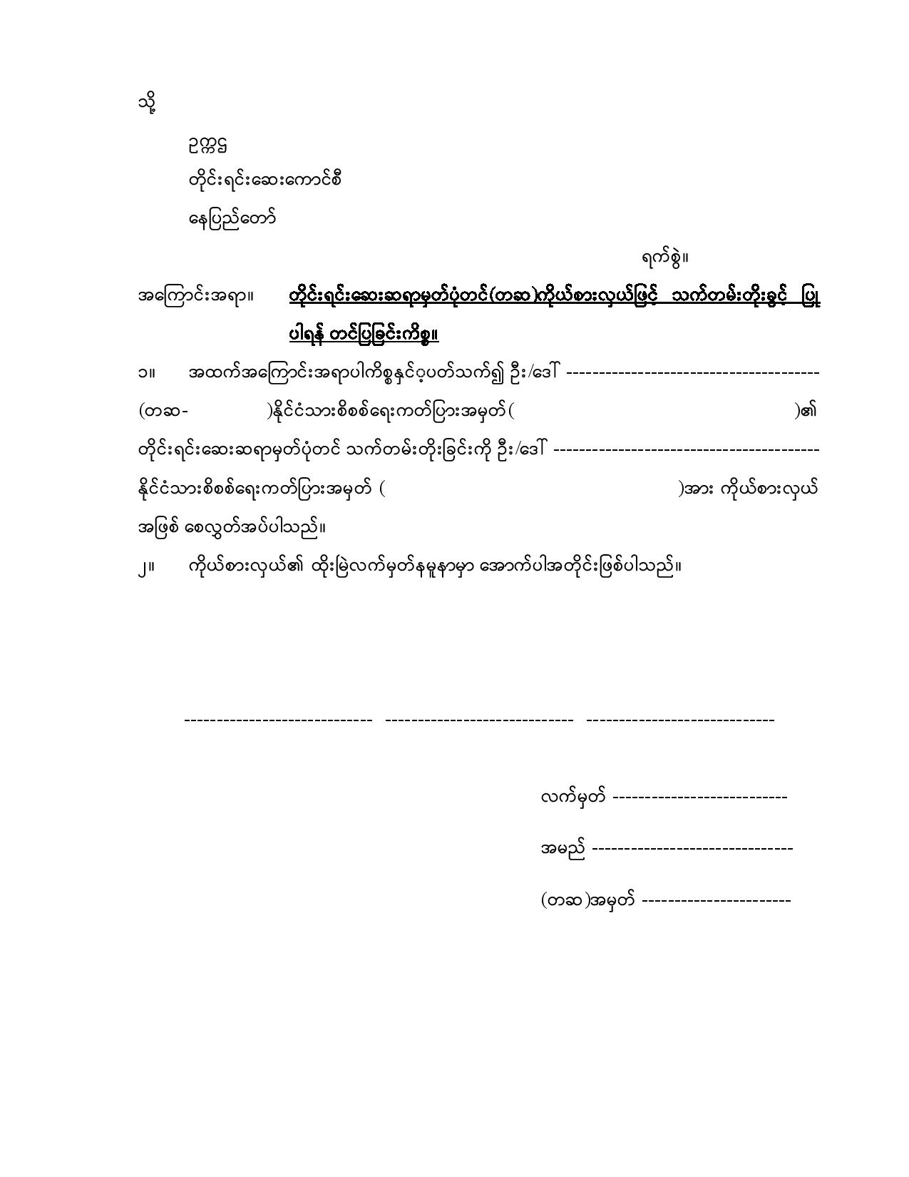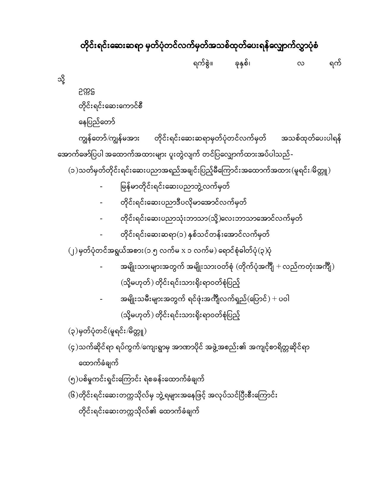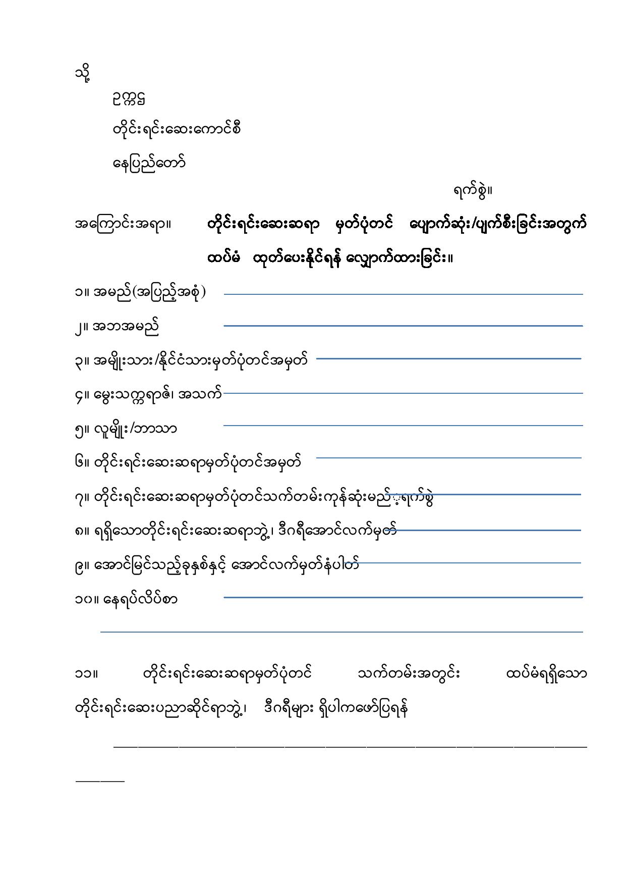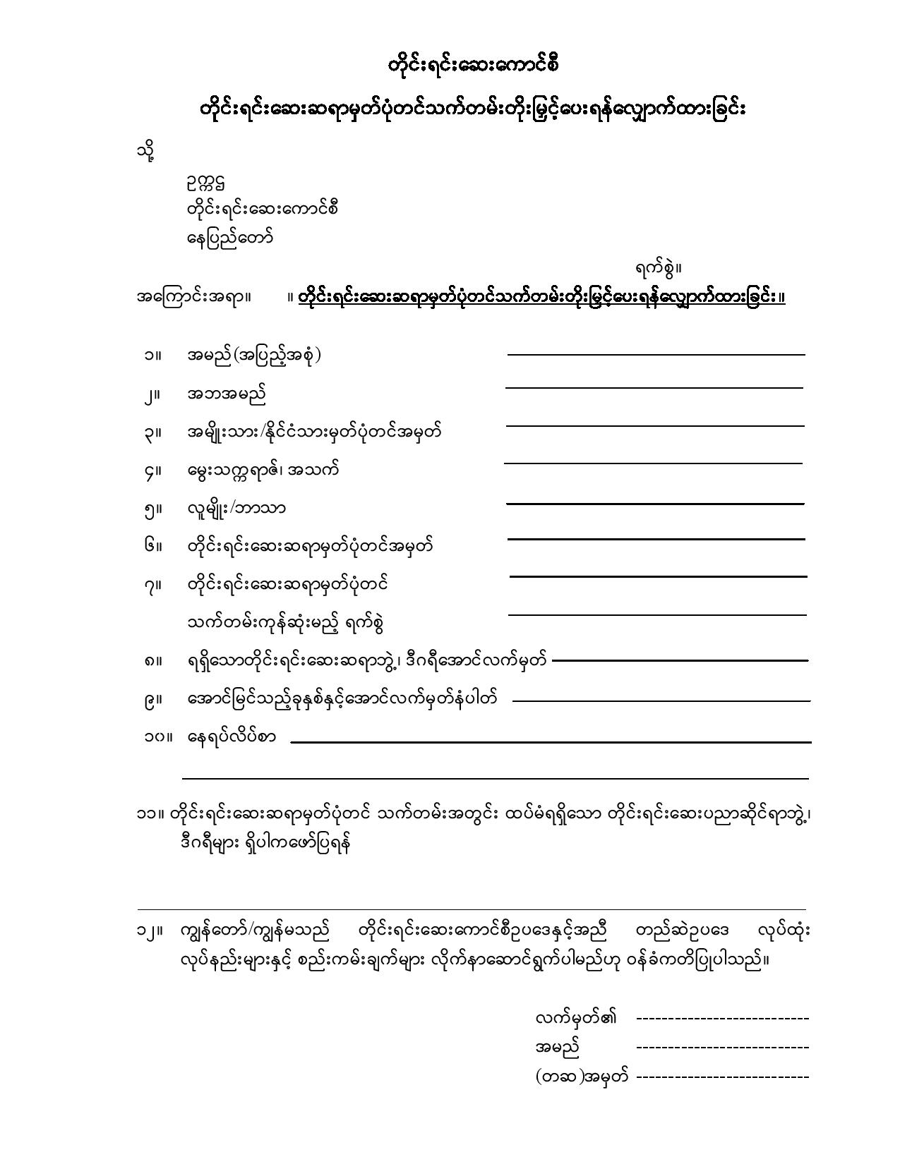တိုင်းရင်းဆေးဆရာ မှတ်ပုံတင်လက်မှတ်အသစ်ထုတ်ပေးရန်လျှောက်လွှာပုံစံ