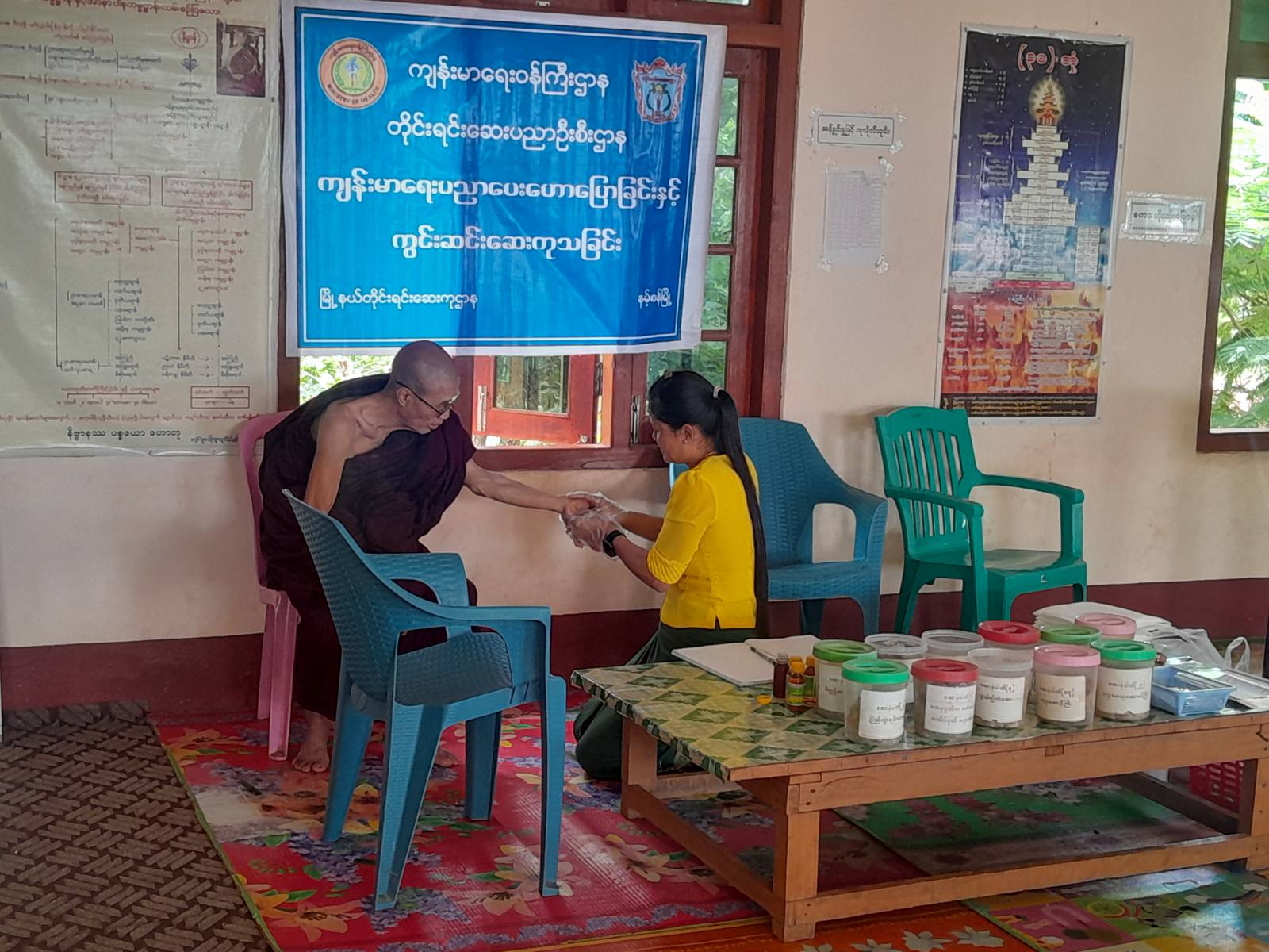 ရှမ်းပြည်နယ်တောင်ပိုင်း၊ နမ့်စန်မြို့နယ် တိုင်းရင်းဆေးကုဌာနမှ ၉.၈.၂၀၂၅ ရက်နေ့တွင် မြို့နယ်တိုင်းရင်းဆေးမှူး ဒေါ်နန်းဟွမ်ခမ်းသည် အမှတ် ၂ ရွာ ၊မက်မွန်းမုန်းကျေးရွာအုပ်စု၊ ဖားအောက်တောရကျောင်း၌ ကျား၁၆ ဦး၊မ ၅ ဦး၊ စုစုပေါင်း ၂၁ ဦးအားတိုင်းရင်းဆေးဖြင့်ကျန်းမာရေး. စောင့်ရှောက်ခဲ့ပါသည်။