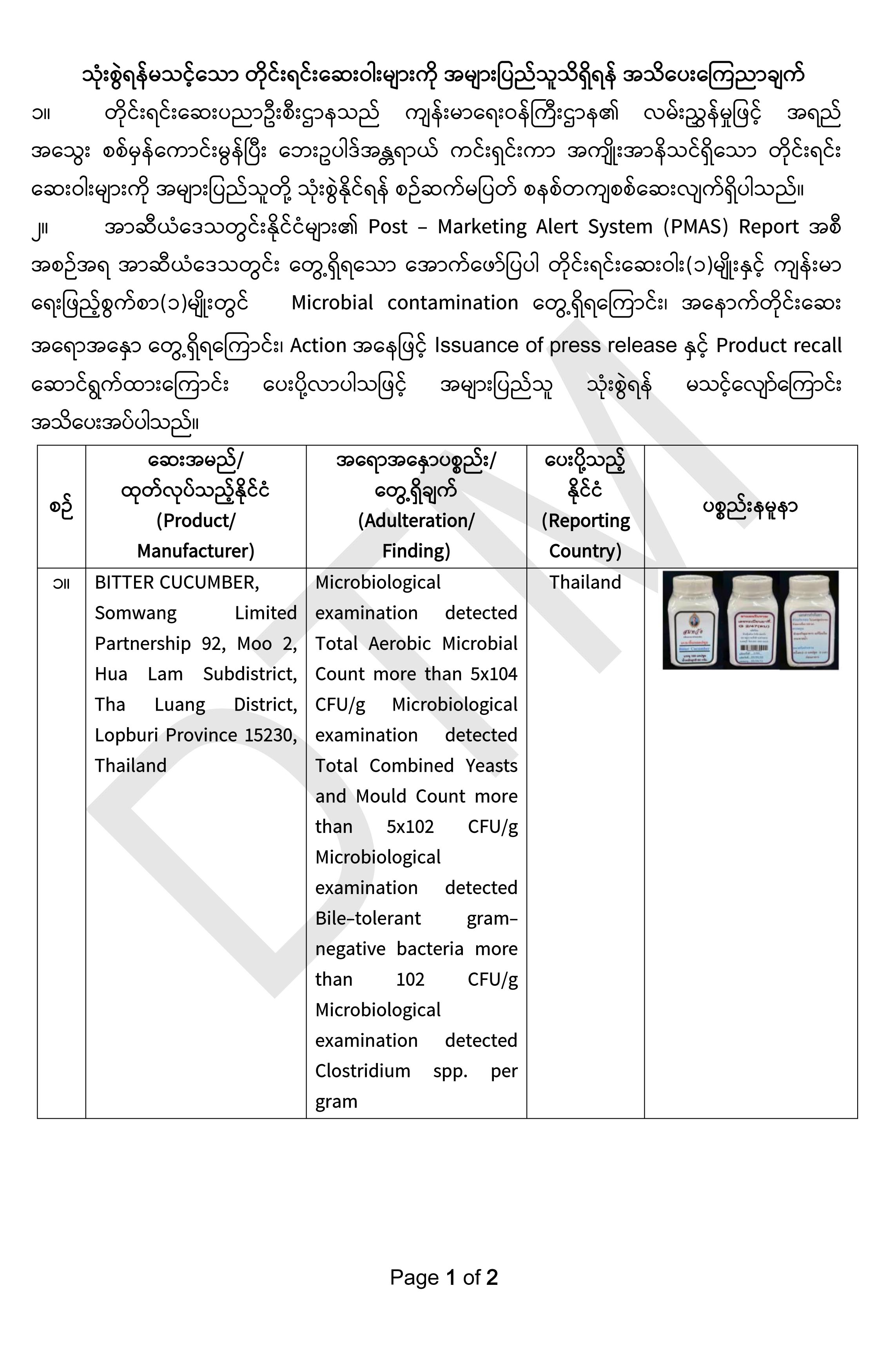 ၂။         အာဆီယံဒေသတွင်းနိုင်ငံများ၏ Post – Marketing Alert System (PMAS) Report အစီ အစဉ်အရ အာဆီယံဒေသတွင်း တွေ့ရှိရသော အောက်ဖော်ပြပါ တိုင်းရင်းဆေးဝါး(၁)မျိုးနှင့် ကျန်းမာ ရေးဖြည့်စွက်စာ(၁)မျိုးတွင်   Microbial contamination တွေ့ရှိရကြောင်း၊ အနောက်တိုင်းဆေး အရောအနှော တွေ့ရှိရကြောင်း၊ Action အနေဖြင့် Issuance of press release နှင့် Product recall ဆောင်ရွက်ထားကြောင်း ပေးပို့လာပါသဖြင့် အများပြည်သူ သုံးစွဲရန် မသင့်လျော်ကြောင်း အသိပေးအပ်ပါသည်။