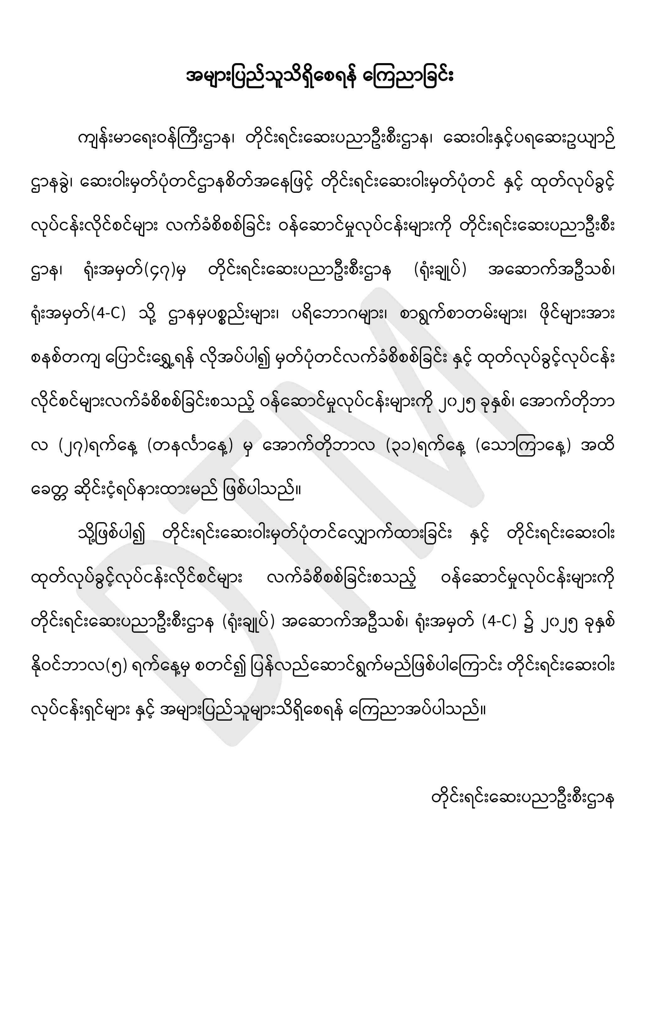 သို့ဖြစ်ပါ၍ တိုင်းရင်းဆေးဝါးမှတ်ပုံတင်လျှောက်ထားခြင်း နှင့် တိုင်းရင်းဆေးဝါး ထုတ်လုပ်ခွင့်လုပ်ငန်းလိုင်စင်များ လက်ခံစိစစ်ခြင်းစသည့် ဝန်ဆောင်မှုလုပ်ငန်းများကို တိုင်းရင်းဆေးပညာဦးစီးဌာန (ရုံးချုပ်) အဆောက်အဦသစ်၊ ရုံးအမှတ် (4-C) ၌ ၂၀၂၅ ခုနှစ် နိုဝင်ဘာလ(၅) ရက်နေ့မှ စတင်၍ ပြန်လည်ဆောင်ရွက်မည်ဖြစ်ပါကြောင်း တိုင်းရင်းဆေးဝါး လုပ်ငန်းရှင်များ နှင့် အများပြည်သူများသိရှိစေရန် ကြေညာအပ်ပါသည်။